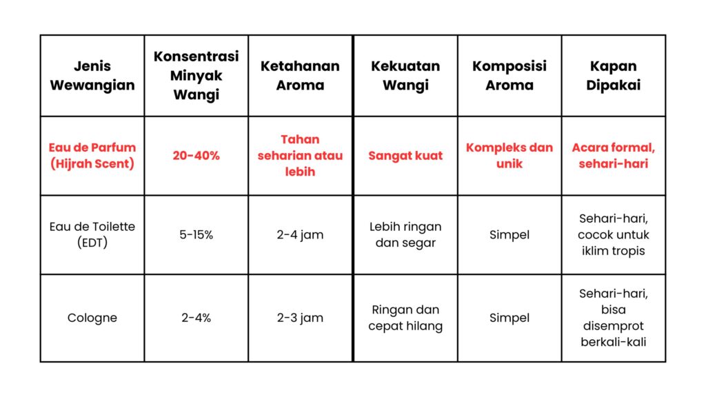 Untuk mengetahui keistimewaannya, mari kita bandingkan dengan jenis parfum lainnya yang umum digunakan.